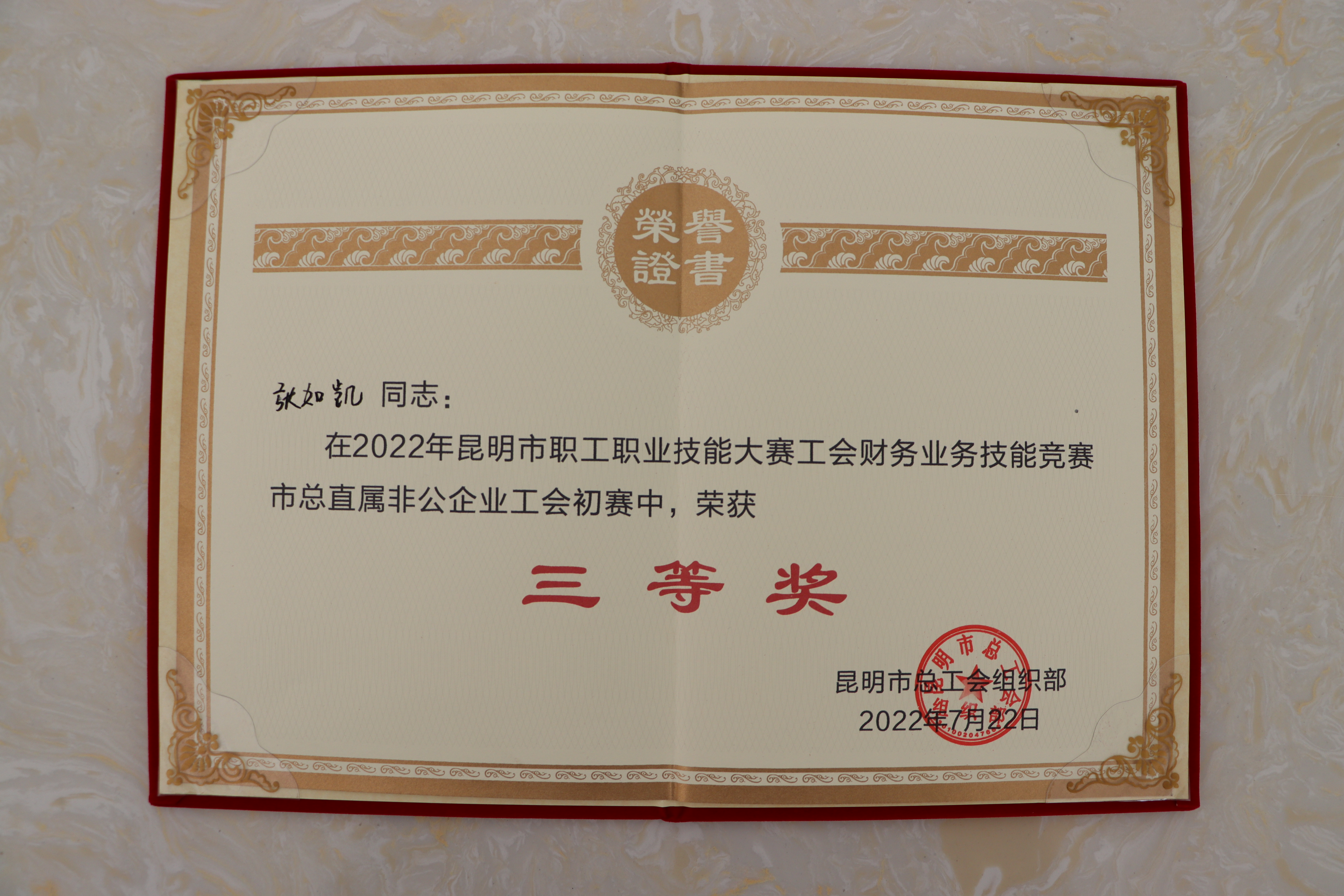 2022年7月22日下午,昆明市高速公路建设开发股份有限公司下属昆明东南绕城高速公路开发有限公司张如凯同志代表公司参加昆明市总工会举办的“喜迎二十大 建功新时代 当好排头兵”职工职业技能大赛工会财务业务技能竞赛初赛,荣获“三等奖”。