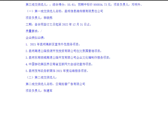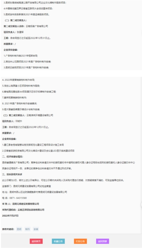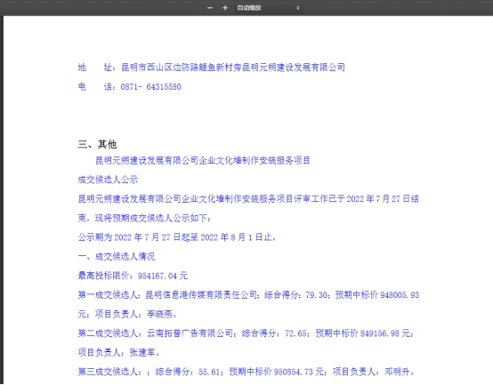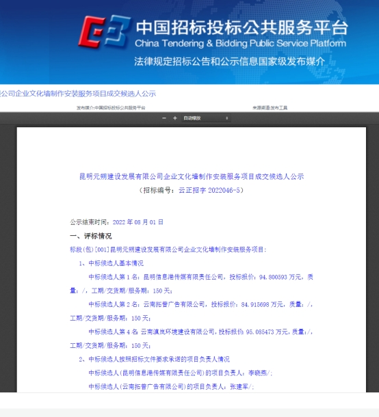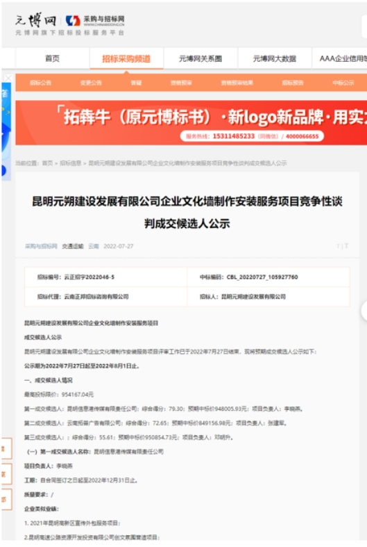 昆明元朔建设发展有限公司企业文化墙制作安装服务项目评标结果公示