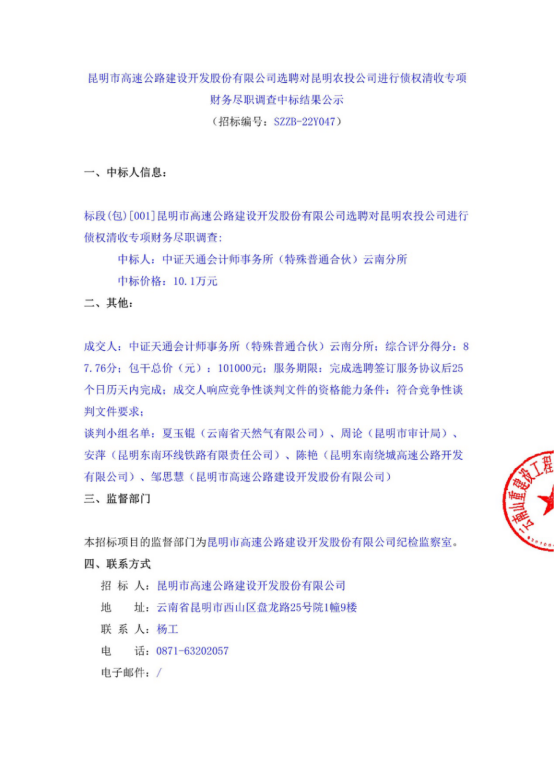 昆明市高速公路建设开发股份有限公司选聘对昆明农投公司进行债权清收专项财务尽职调查中标结果公示