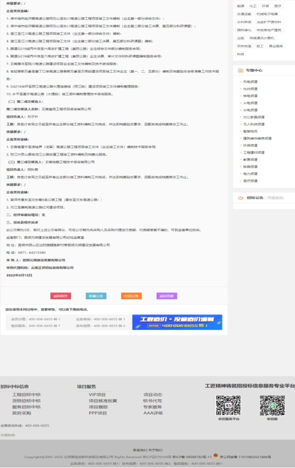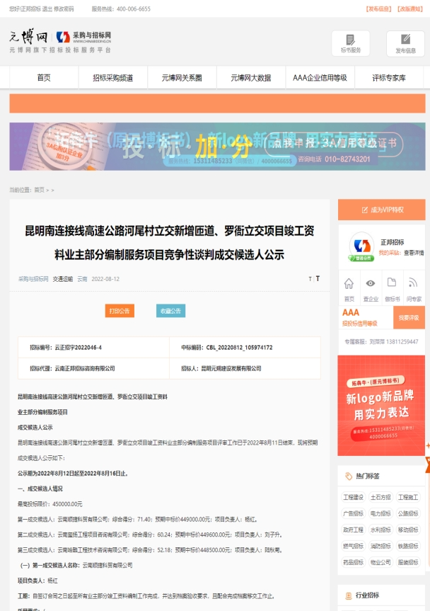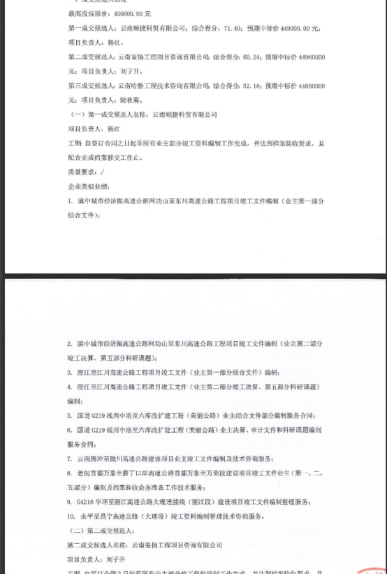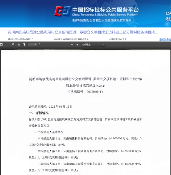 昆明南连接线高速公路河尾村立交新增匝道、罗衙立交项目竣工资料业主部分编制服务项目评标结果公示