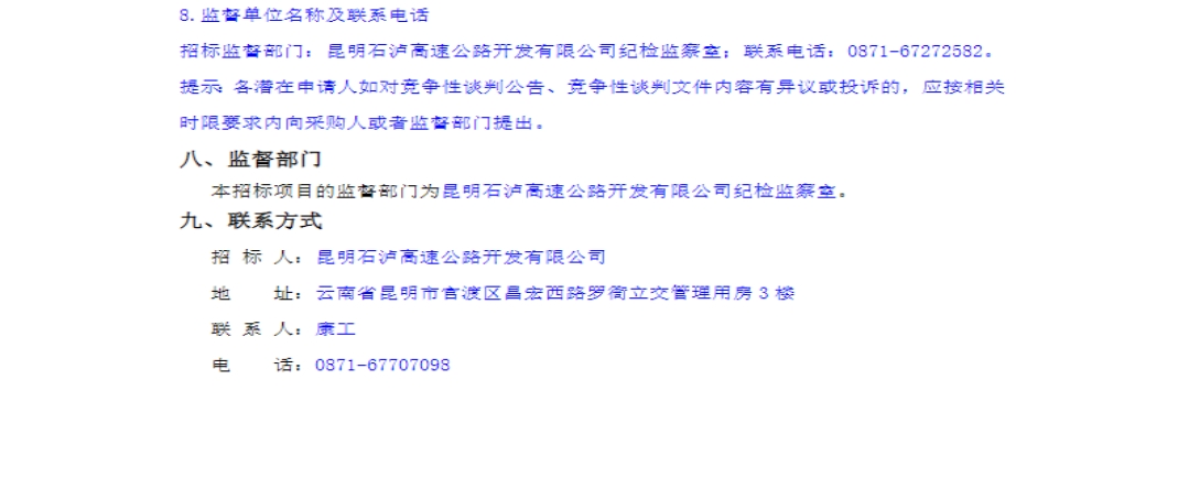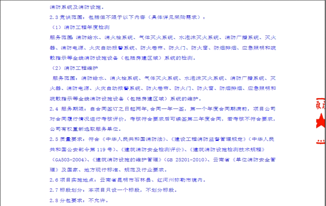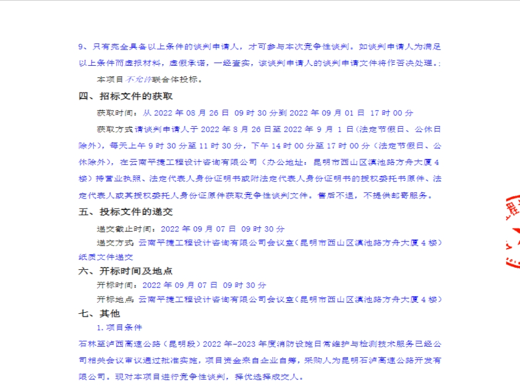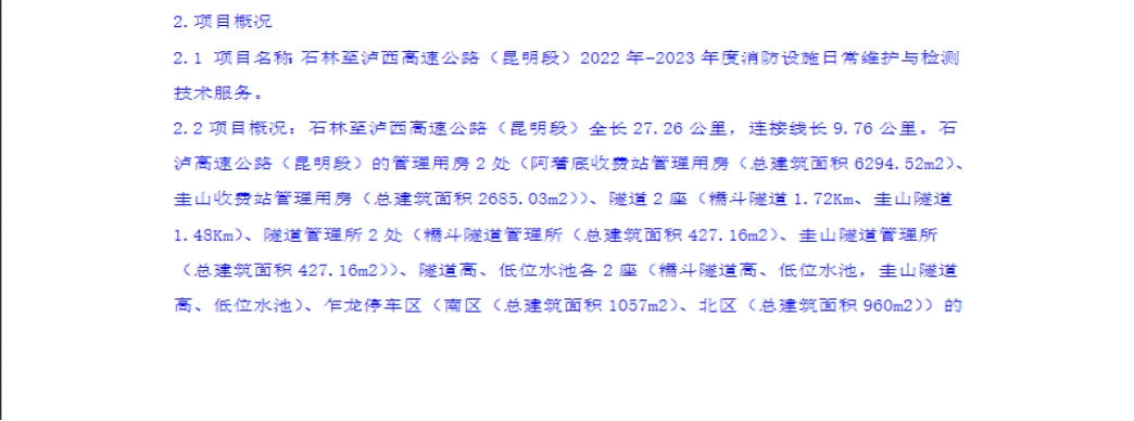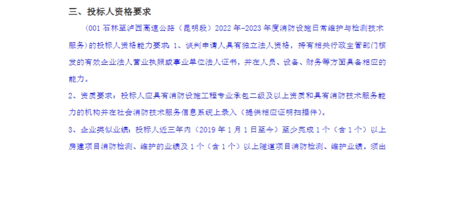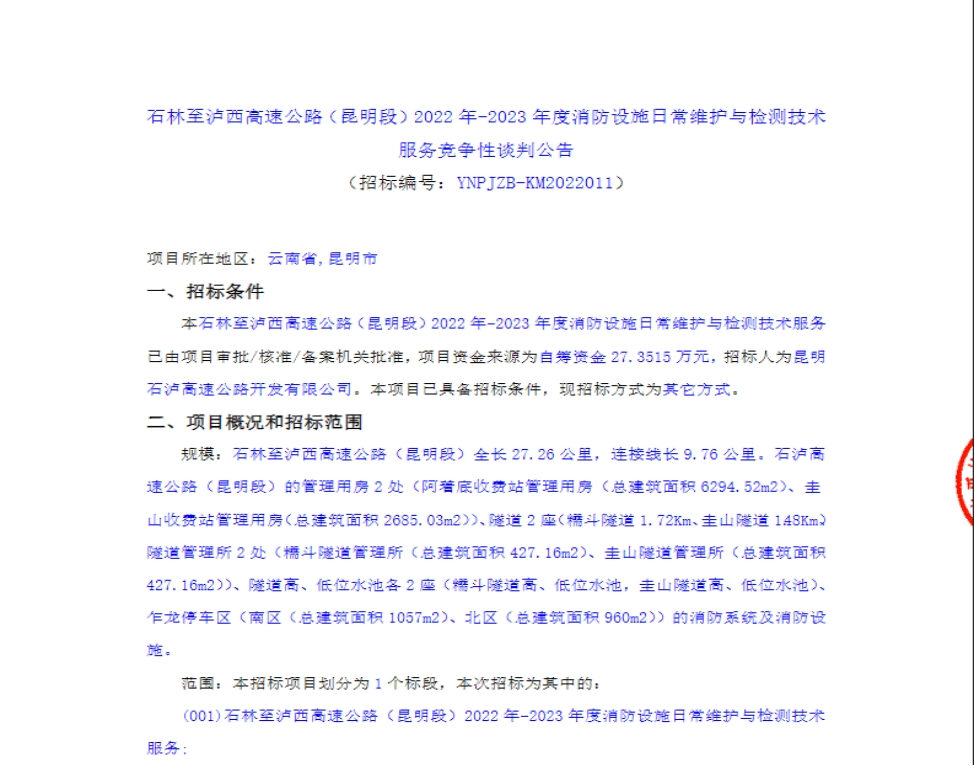 石林至泸西高速公路(昆明段)2022年-2023年度消防设施日常维护与检测技术服务竞争性谈判公告
