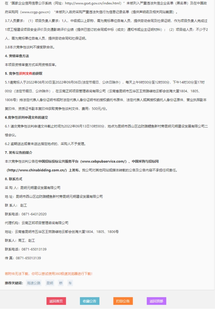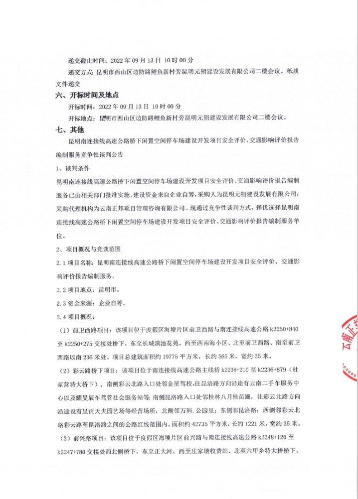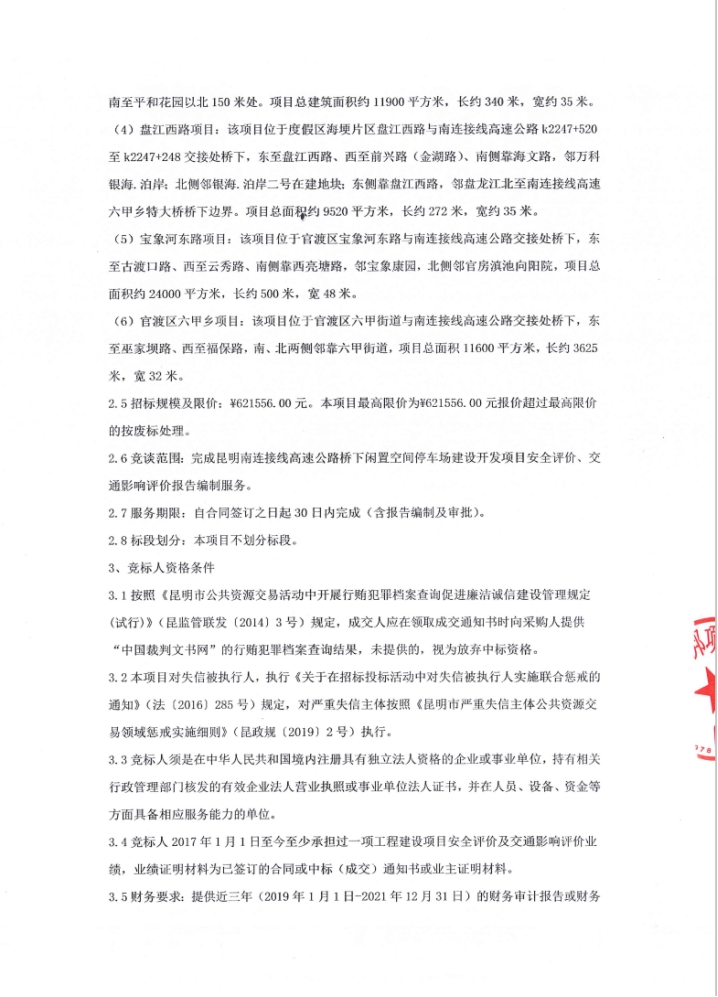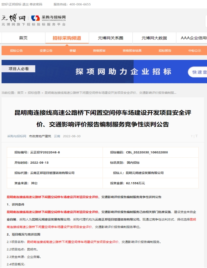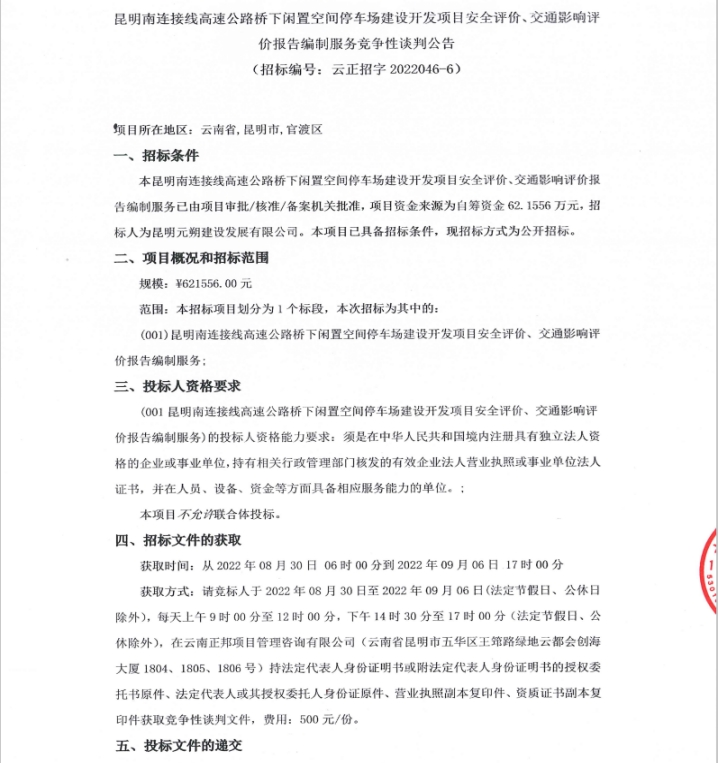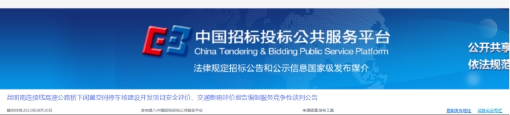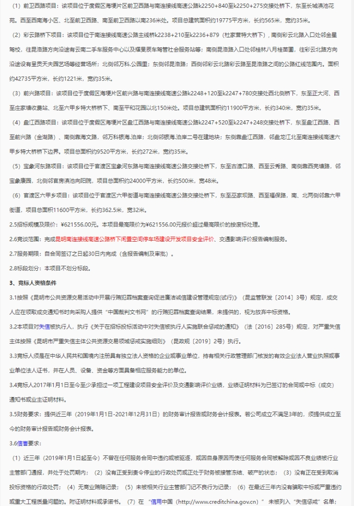 昆明南连接线高速公路桥下闲置空间停车场建设开发项目安全评价、交通影响评价报告编制服务竞争性谈判公告