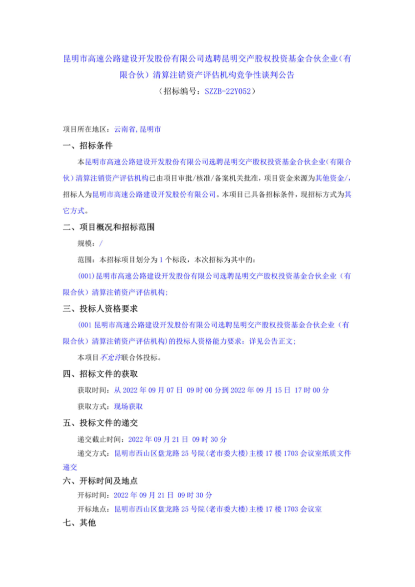 昆明市高速公路建设开发股份有限公司选聘昆明交产股权投资基金合伙企业(有限合伙)清算注销资产评估机构竞争性谈判公告