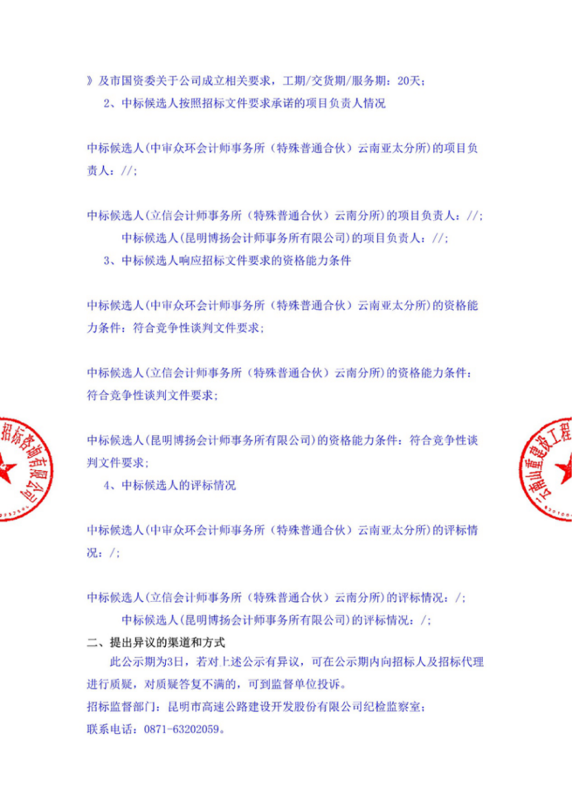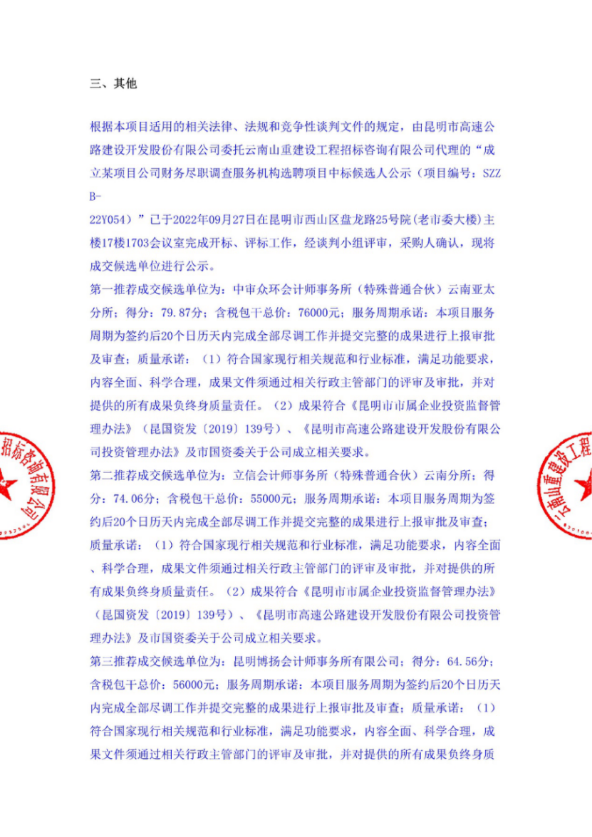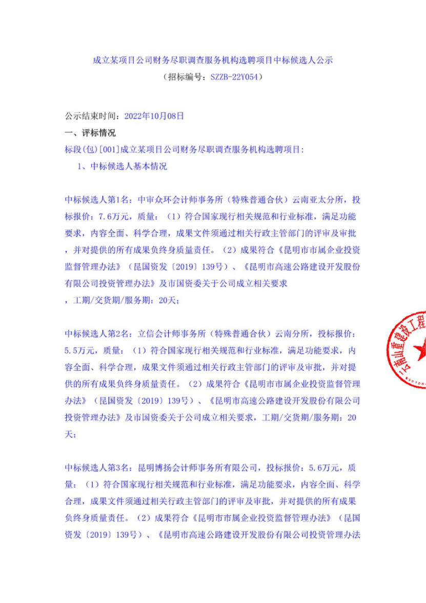 成立某项目公司财务尽职调查服务机构选聘项目中标候选人公示