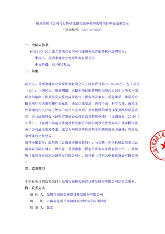 成立某项目公司可行性研究报告服务机构选聘项目中标结果公示