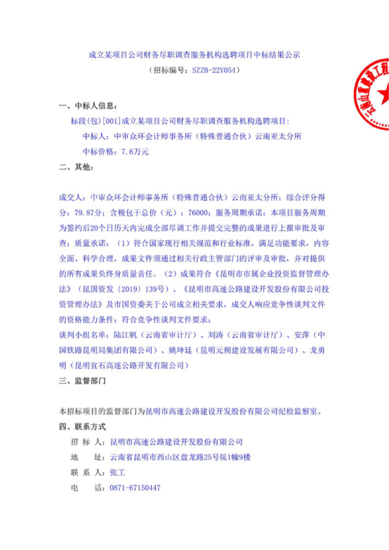 成立某项目公司财务尽职调查服务机构选聘项目中标结果公示