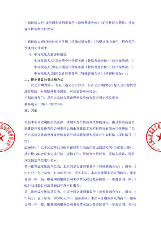 昆明市高速公路建设开发股份有限公司选聘年报专项审计中介机构中标候选人公示
