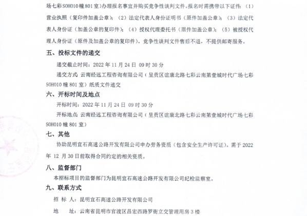 昆明宜石高速公路开发有限公司劳务资质申办技术咨询服务竞争性谈判公告