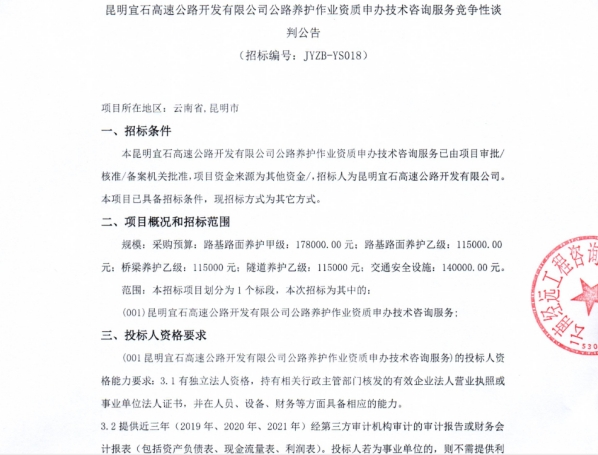 昆明宜石高速公路开发有限公司公路养护作业资质申办技术咨询服务竞争性谈判公告