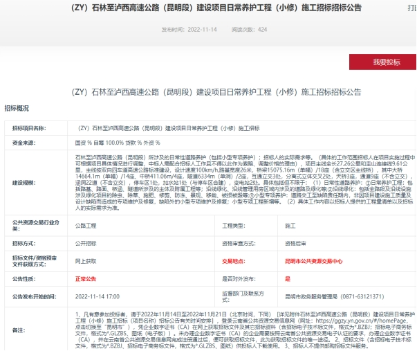石林至泸西高速公路(昆明段)建设项目日常养护工程(小修)施工招标公告