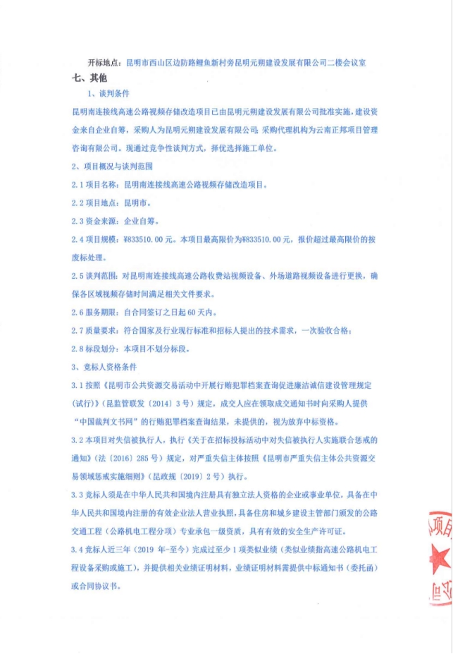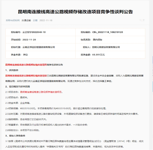 昆明南连接线高速公路视频存储改造项目竞争性谈判公告