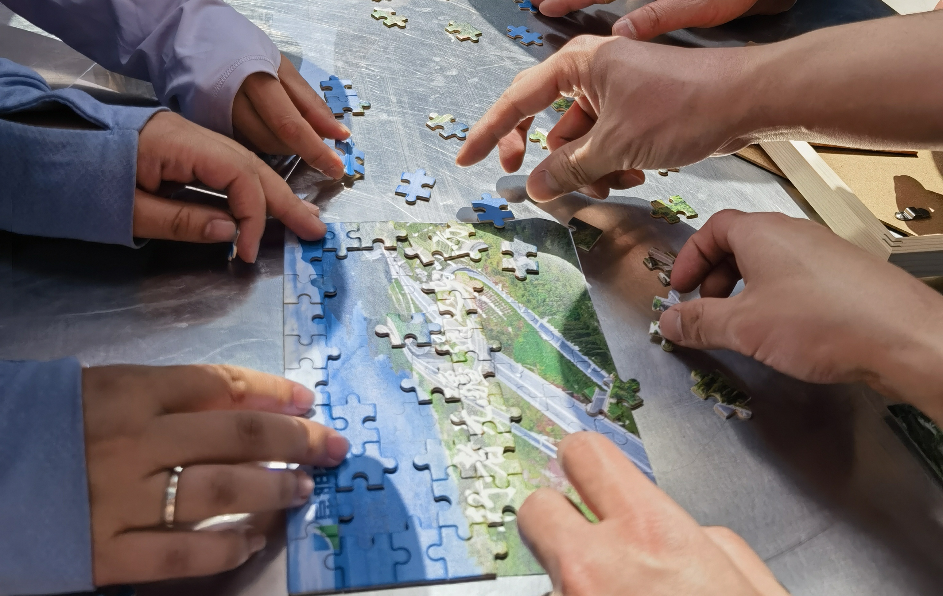 比赛开始,参赛队员们紧密合作,一起动手动脑,发挥集体智慧、团队协作的优势,将拼图遇到的各种难题巧妙解决,很快,杂乱无章的碎片便组合成一幅幅“行者无疆 通达四方”的画面,寓意公司围绕人民群众美好出行需要,志在四方、一路凯歌的目标期许。