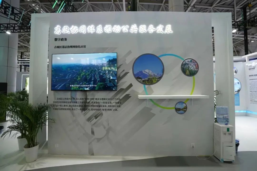 数字政务板块以“高效协同体系推动公共服务发展”为主题,展示了云南省政务服务平台和丽江市古城区基层治理网格化应用等样板案例。