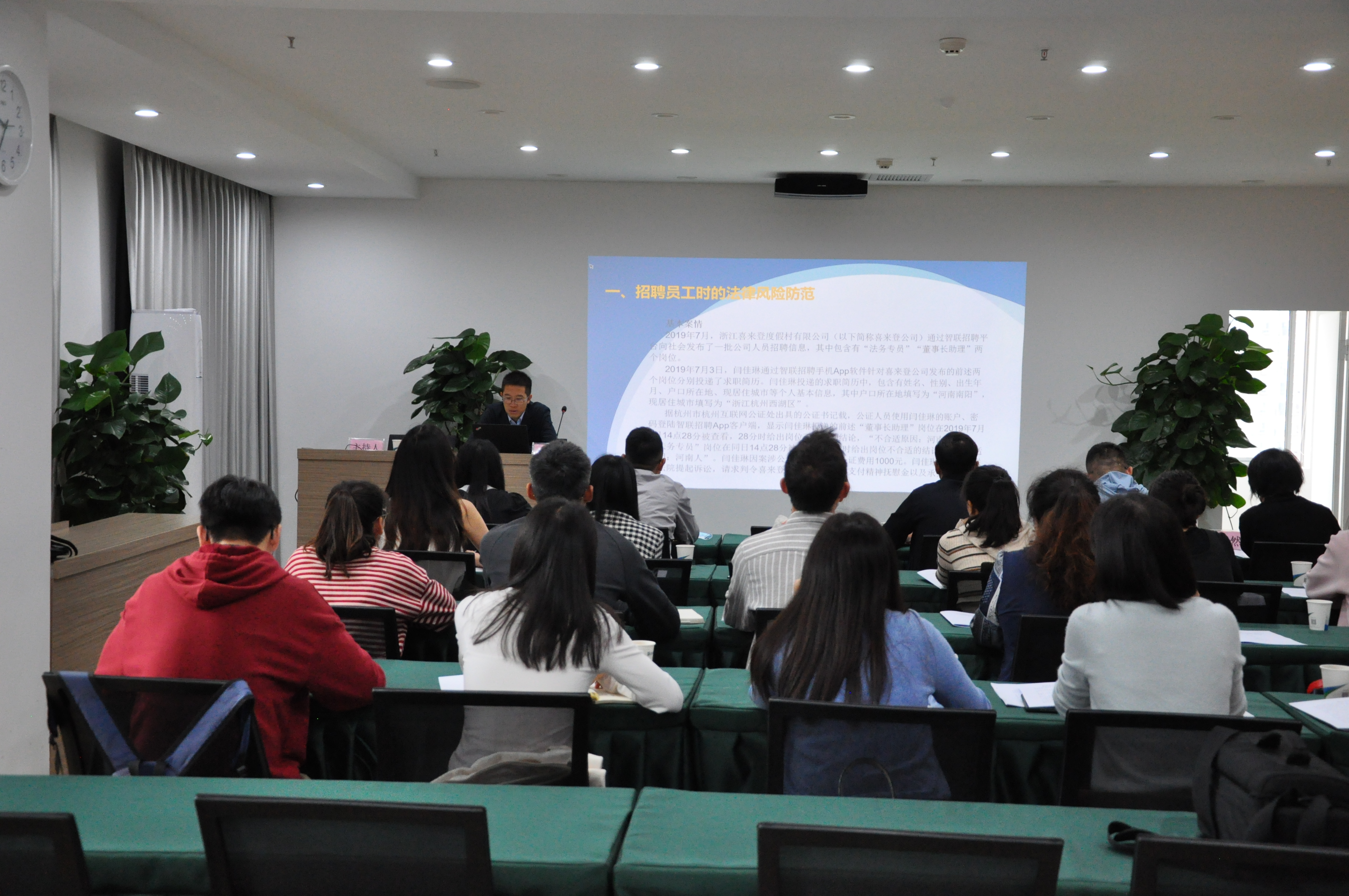 结合公司前期培训需求摸底情况调查,设置了劳动合同法实务培训、招聘面试技能培训课程。培训邀请公司法律顾问李萌律师,围绕员工招聘的法律风险防范,员工录用的程序和注意事项,企业规章制度制定、劳务派遣的法律风险防范四个方面结合典型案例逐一分析解读,讲明劳动用工管理的风险点及规避风险的有效措施,并在随后的互动环节中,对参训人员提出的劳动用工管理方面的问题进行答疑解惑。同时,培训还邀请第三方人才服务机构老师指导参训人员开展分组模拟面试。通过题本拟写、角色扮演、考场布置等环节的现场演练,帮助参训人员走出认识误区,明确规范化面试的要求。