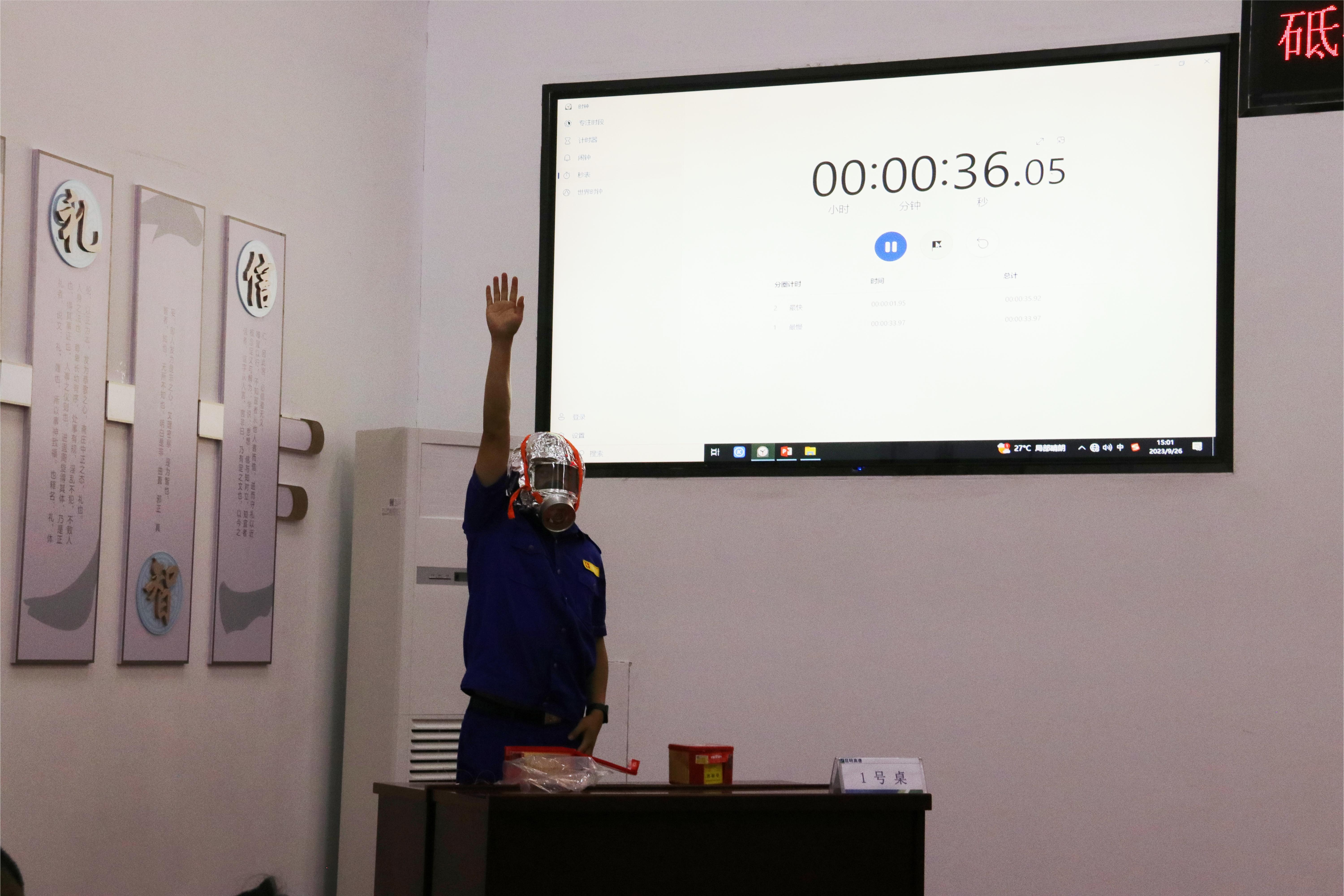 在防毒面具穿戴项目中,参赛选手与时间赛跑,迅速完成防毒面具的组装、穿戴、气密性检查,操作迅速、有条不紊,生动展现出救援刻不容缓的紧急场面。