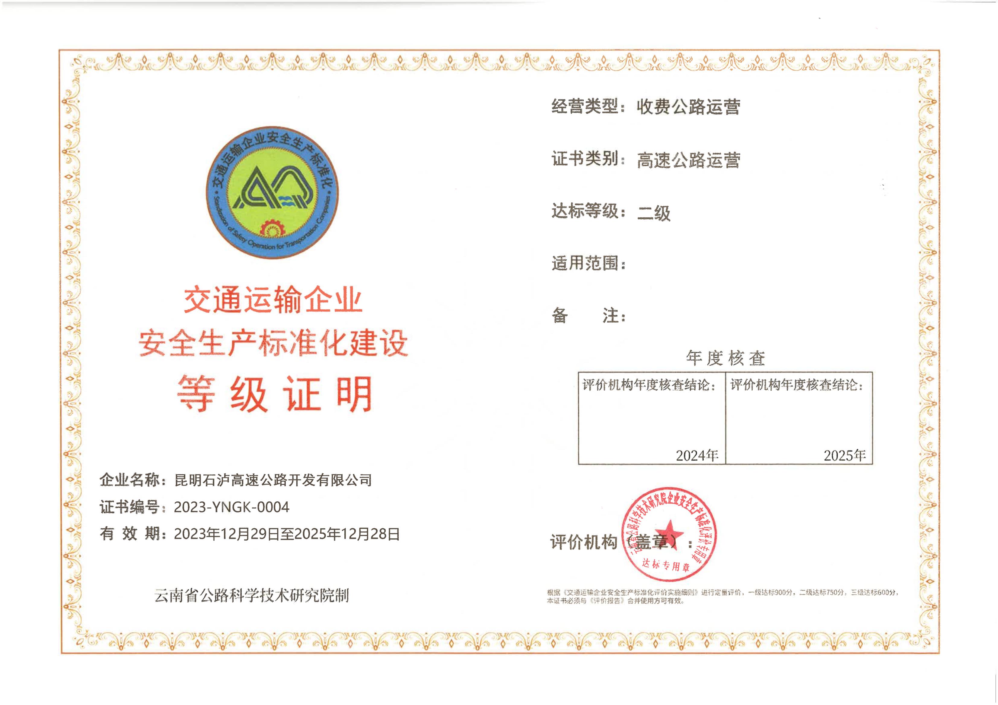 宜石公司“高速公路运营企业安全生产标准化二级”证书