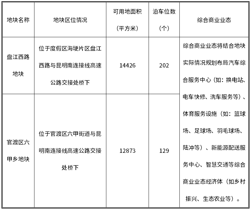 2.1.3合作开发内容:昆明南连接线高速公路桥下5个空置场地主要围绕公共停车场+充(换)电站+预留场地综合商业业态(三大模块)的方式分期投入建设并陆续开发。第一期为5个地块公共停车场基础设施建设工程;第二期为地块服务配套提升、充电站扩增、换电站建设及预留空地综合商业业态开发。
