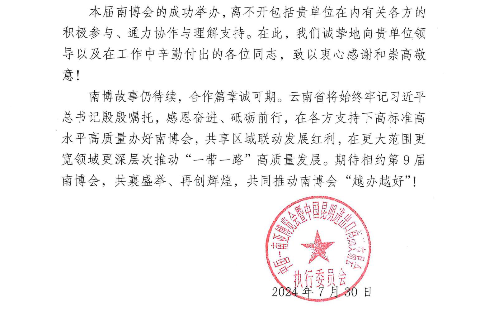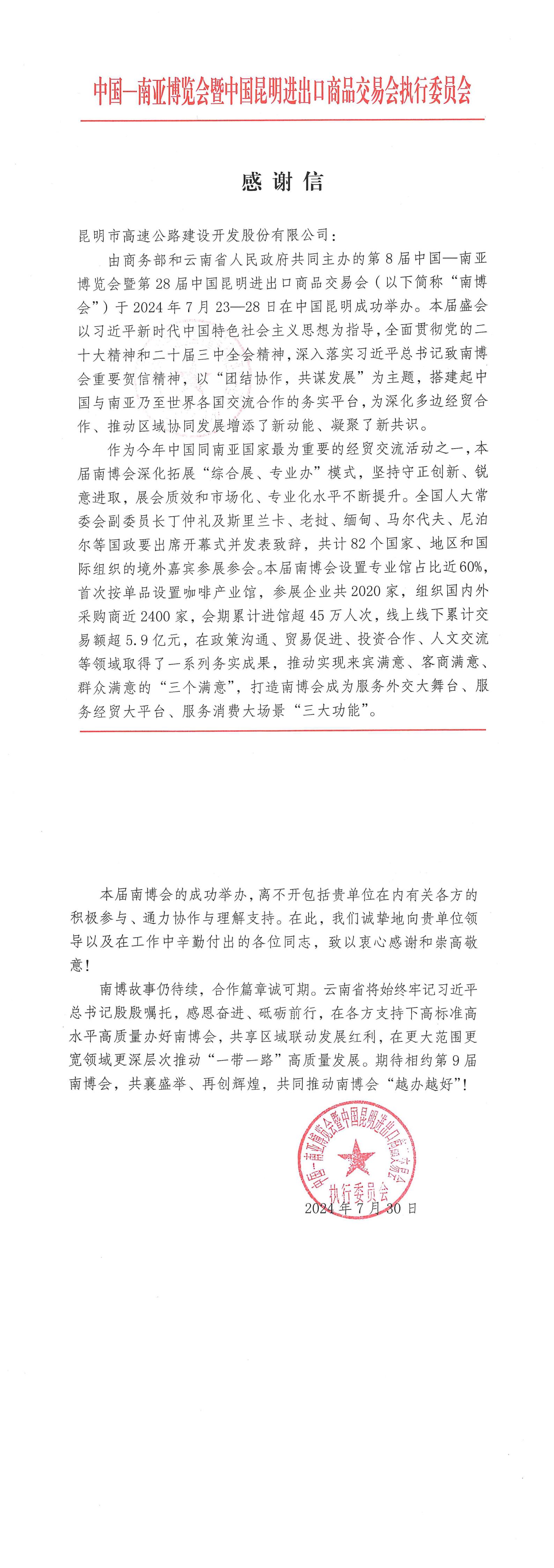 近日,昆明高速公路收到南博会主办方感谢信。304永利集团下辖昆明南连接线高速公路是通往第8届中国-南亚博览会暨第28届中国昆明进出口商品交易会(简称“南博会”)会场的主要通道。在南博会期间,昆明南连接线高速公路积极响应号召,提前安排部署,南博会”期间累计服务车流量 111.89万辆·次,圆满完成昆明南连接线高速公路保通保畅任务。