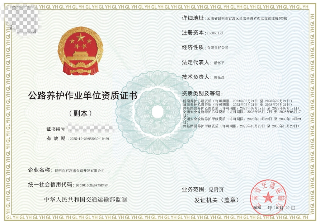 10月29日,304永利集团下属宜石公司成功取得公路养护作业单位“交通安全设施养护甲级资质”与“路基路面养护甲级资质”两项重要资质证书。
